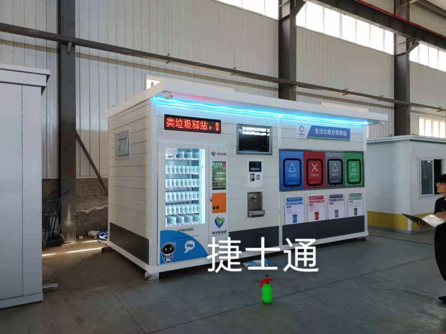 7、最最吸引眼球的就是这个兑换方式了,在垃圾房前段,有一个兑换的自动兑换机,高积分吸引了很多孩子和大人投放垃圾,得到的积分随时兑换,有饮料,有垃圾袋等等,兑换机器后端是垃圾房的另外一个房体,和垃圾房是分开的,完全做到卫生,安全